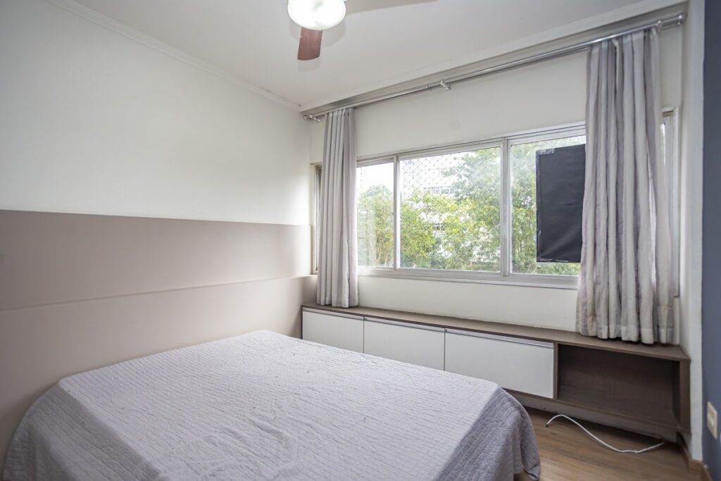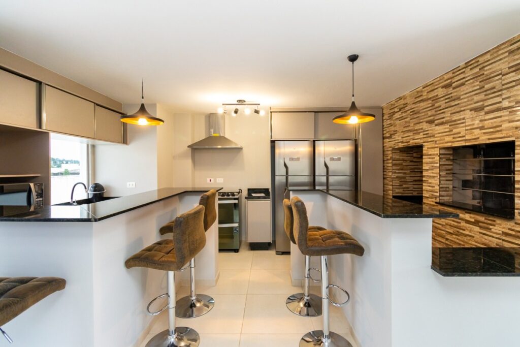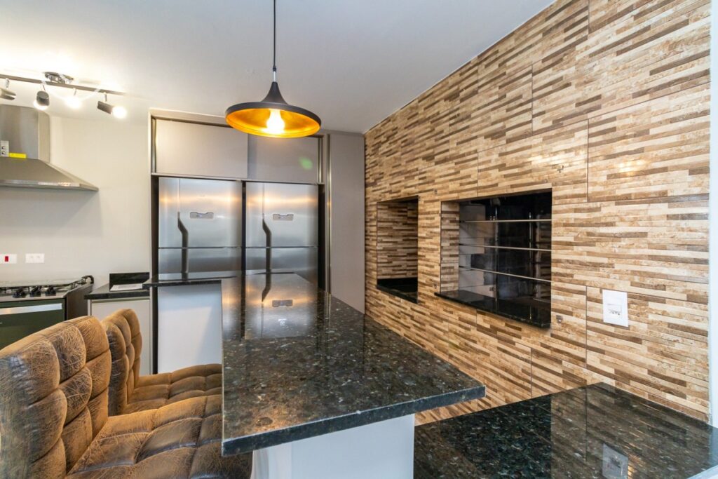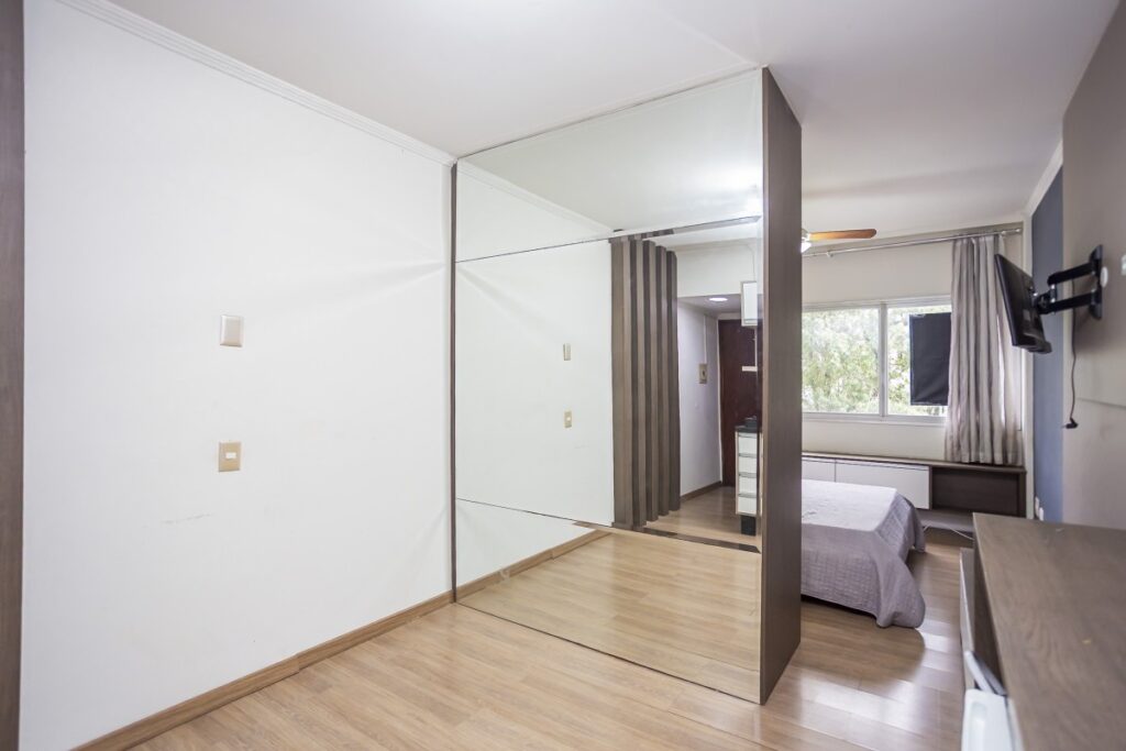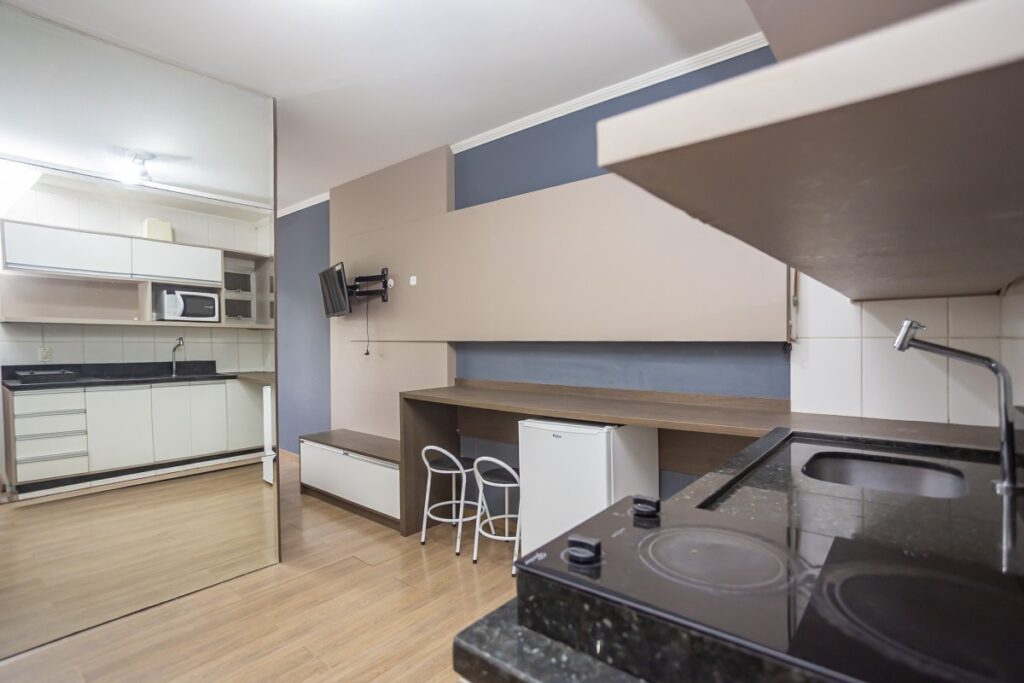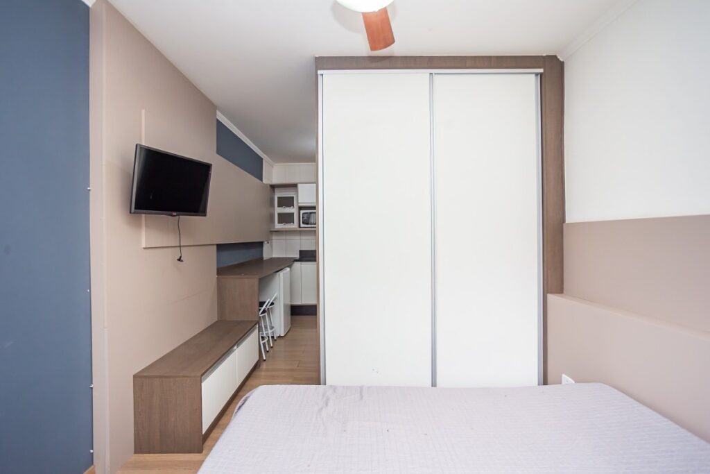 Studio de 24m² pronto para morar, com mobília completa e decoração moderna. O espaço conta com cama de casal, TV, bancada com banquetas e armários planejados, garantindo praticidade e conforto no dia a dia.