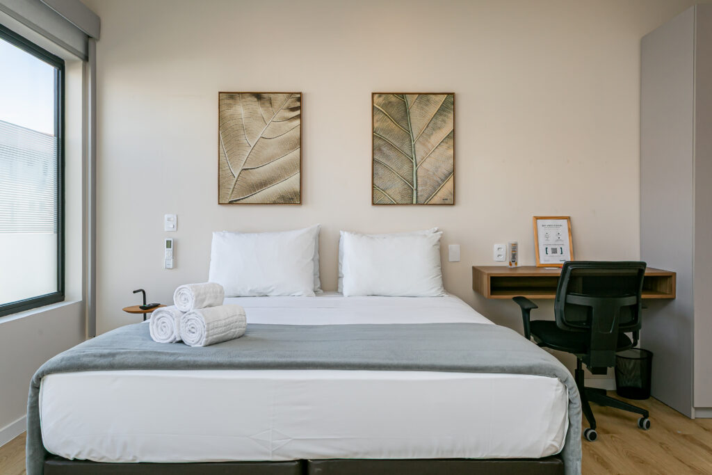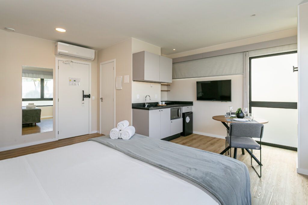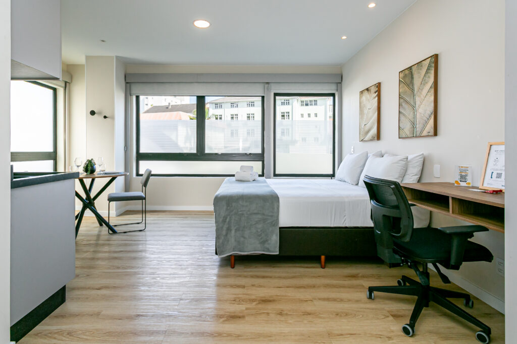 Além disso, o condomínio conta com rooftop com piscina, sauna, academia, lavanderia, mini mercado e espaços compartilhados que facilitam a rotina. Já estão inclusos no condomínio itens que fazem diferença no dia a dia, como energia elétrica da unidade, Wi-Fi de alta velocidade, limpeza semanal do studio e IPTU.
