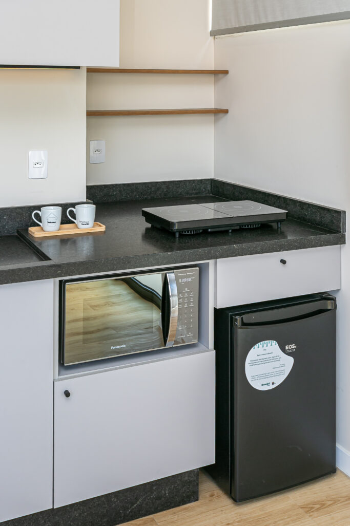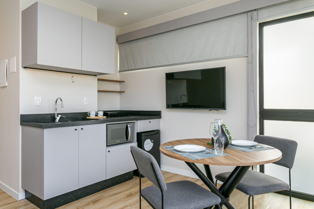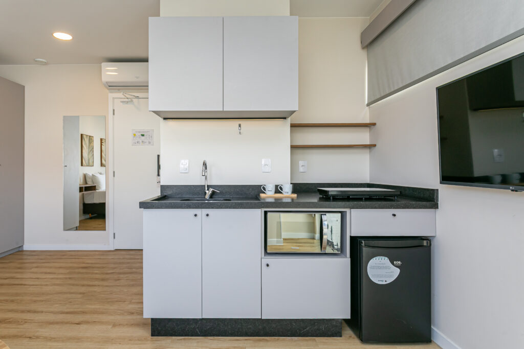Este studio mobiliado de 30m² oferece ambiente funcional, com tudo o que você precisa para o dia a dia.
