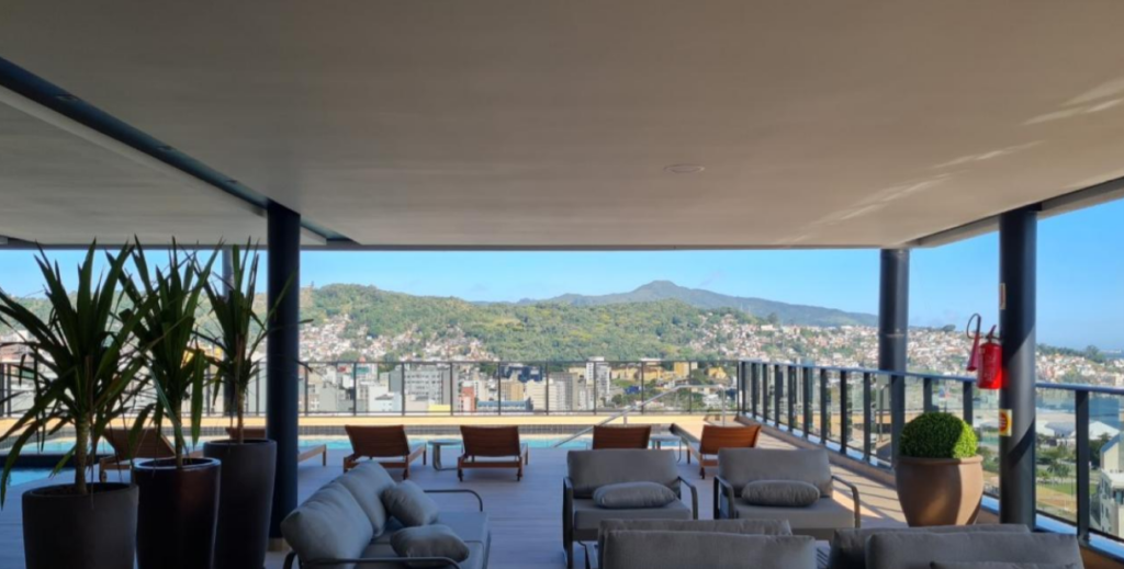Studio de alto padrão com 40m² no Top Vision Residence, no Centro de Florianópolis. Em andar alto, o imóvel oferece excelente iluminação natural, vista aberta e uma planta ampla para a categoria, com metragem acima da média dos studios da região.